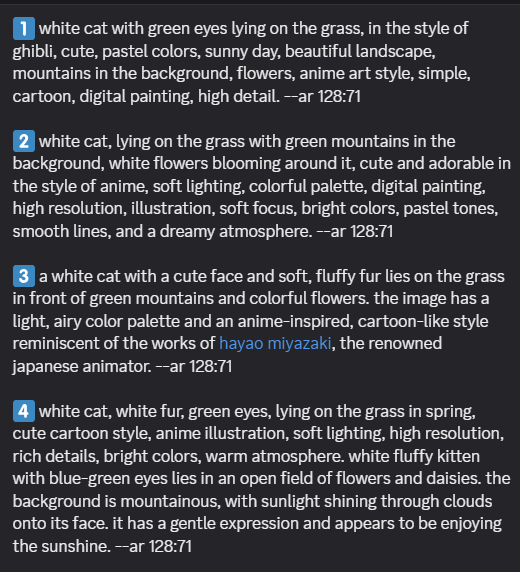 方法②/describeコマンドで画像からプロンプトを生成する方法:画像をアップロードするだけで、AIが自動的にその画像を説明するプロンプトを4パターン提案してくれます。「こんな雰囲気の画像を作りたいけど、どうプロンプトを書けばいいか分からない…」という時に役立ちますよ。