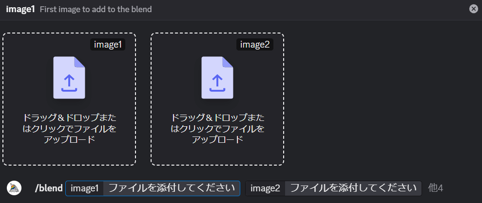 方法③/blendコマンドで複数の画像を混ぜ合わせる方法:2〜5枚の画像をアップロードして、それらを混ぜ合わせた新しい画像を生成する方法です。プロンプトを入力する必要がなく、画像をアップロードするだけで簡単に合成できるので、手軽に試したい方にぴったりです!