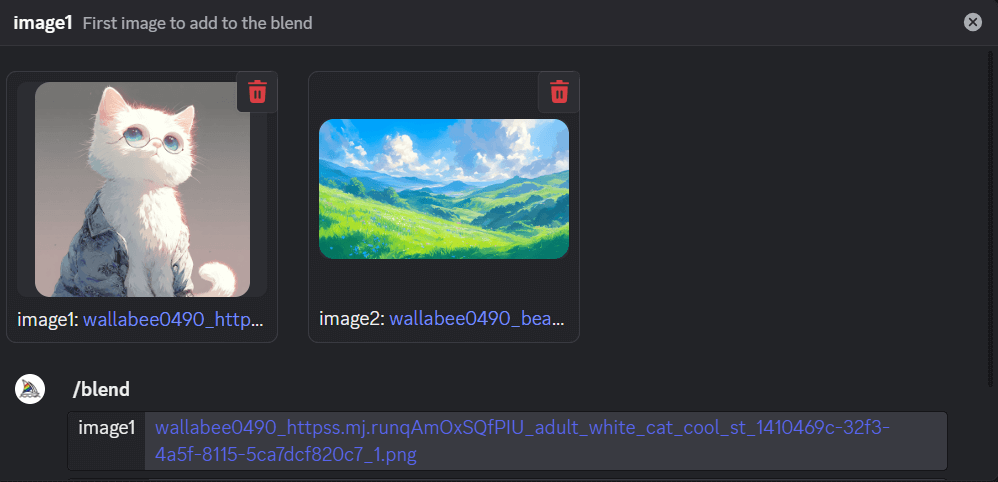 - 「/blend」コマンドを使えば、2枚の画像をアップロードするだけで、AIが2つの画像をいい感じに混ぜ合わせてくれる!