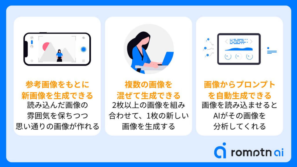 ②複数の画像を混ぜ合わせて新しい画像を作成できる:2枚以上の画像を組み合わせて、1枚の新しい画像を生成することもできます。「このキャラクターの顔」と「あの背景」を組み合わせたい、といった使い方ができるので、表現の幅がグッと広がります!