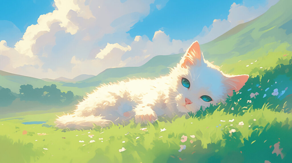 2枚の画像の特徴がうまく混ざり合って、草原で気持ちよさそうに眠る白い猫の画像ができました!