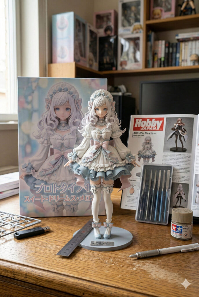 全体的に、元画像のカラーリングを取り入れてください。フィギュアの後ろにパッケージを添えてください。背景は、自室のデスクの上。実際のフィギュアらしいサイズ感が分かるような情報を入れてください。