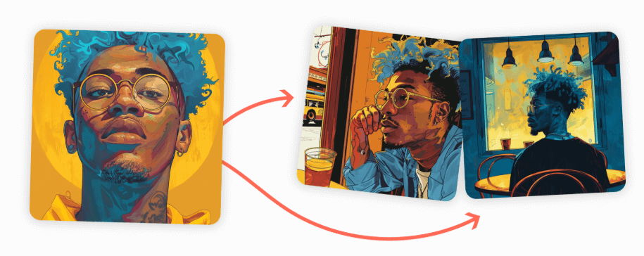 同じ人物を違うポーズや服装で描きたい場合や、漫画のキャラクターを一貫して表現したい時に活用します。顔の形や目の形、髪型といったキャラクター固有の特徴を保持してくれるんです!