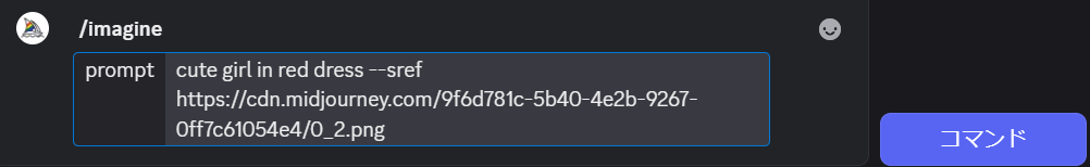通常のプロンプトの後に「–sref」パラメータを追加し、参照したいスタイルを指定するという流れになります。