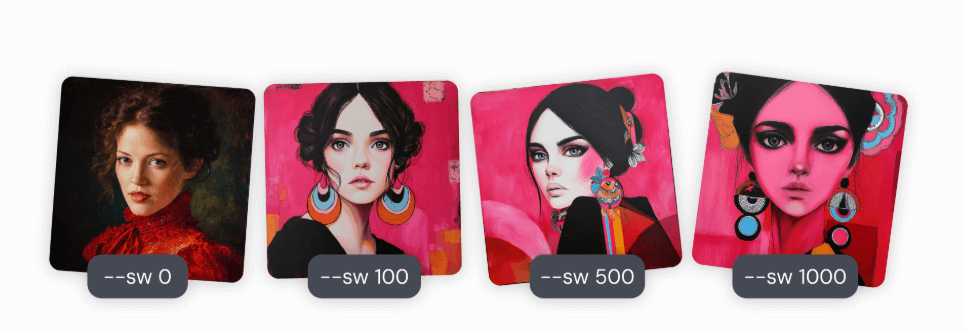 –sw 1000(最大強度):参照画像のスタイルが最も強く反映され、画風の特徴がはっきりと再現されます。統一感を重視したい場合に適しています。