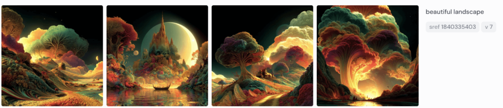 「–sref random」を指定すると、ランダムなスタイルが適用され、生成完了後に具体的な数値コードが表示されます。新しいスタイルを発見したい時におすすめです。