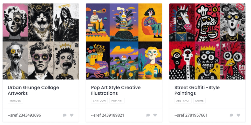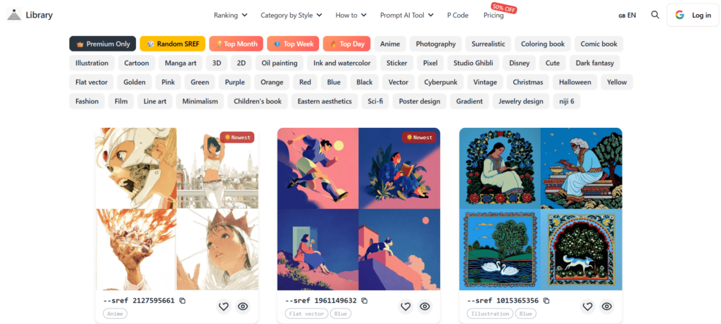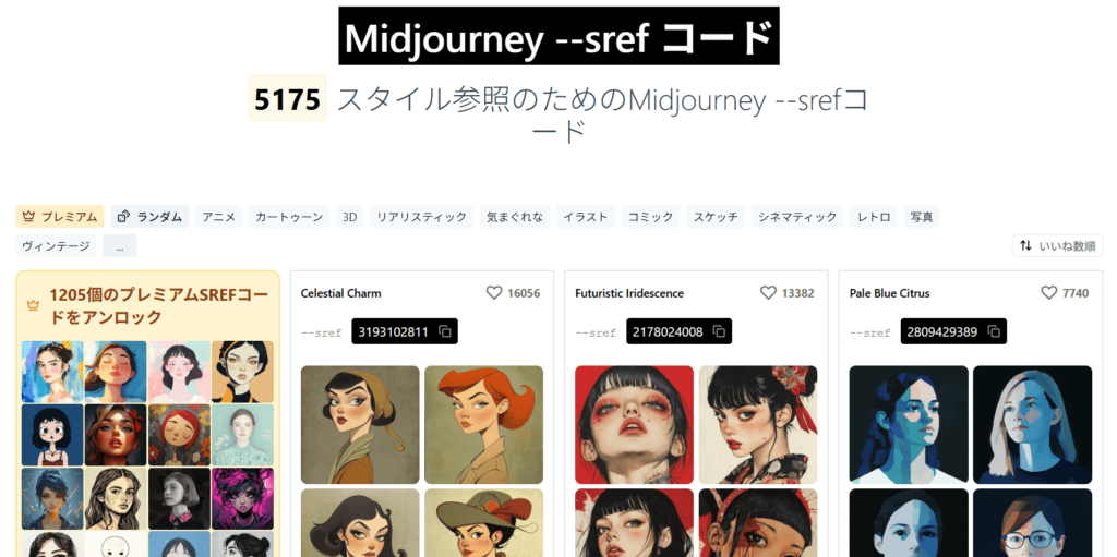 自分でsrefコードを探すのも楽しいですが、世界中のMidjourneyユーザーが発見したコードを共有しているライブラリサイトを活用すると、効率的にお気に入りのスタイルを見つけることができます!