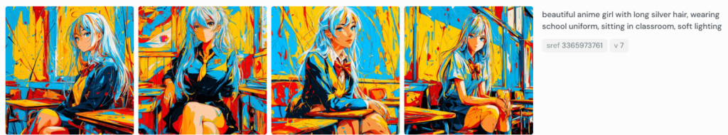 例:beautiful anime girl with long silver hair, wearing school uniform, sitting in classroom, soft lighting --sref 3365973761