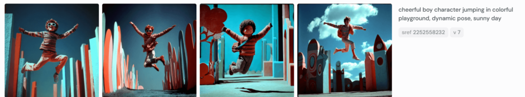 例:cheerful boy character jumping in colorful playground, dynamic pose, sunny day --sref 2252558232