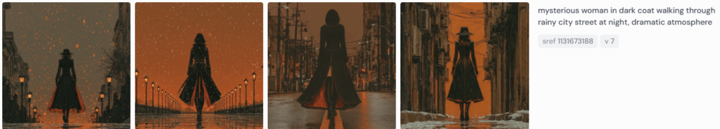 例:mysterious woman in dark coat walking through rainy city street at night, dramatic atmosphere --sref 1131673188