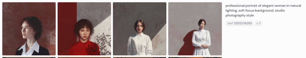 例:professional portrait of elegant woman in natural lighting, soft focus background, studio photography style --sref 3355274295