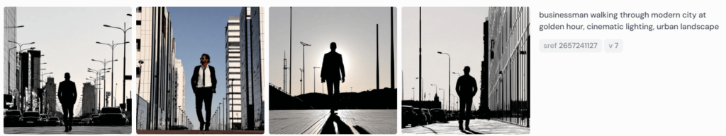 例:businessman walking through modern city at golden hour, cinematic lighting, urban landscape --sref 2657241127
