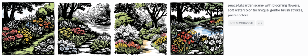 例:peaceful garden scene with blooming flowers, soft watercolor technique, gentle brush strokes, pastel colors --sref 1521862220