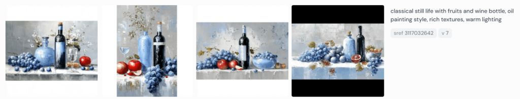 例:classical still life with fruits and wine bottle, oil painting style, rich textures, warm lighting --sref 3117032642