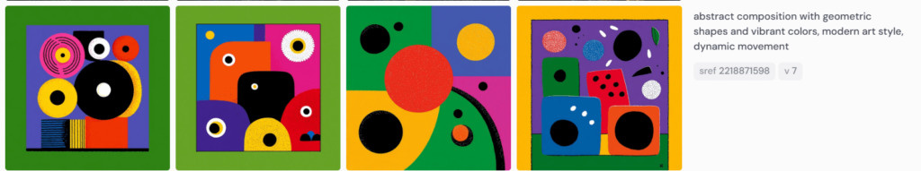 例:abstract composition with geometric shapes and vibrant colors, modern art style, dynamic movement --sref 2218871598