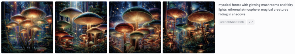 例:mystical forest with glowing mushrooms and fairy lights, ethereal atmosphere, magical creatures hiding in shadows --sref 3556861680