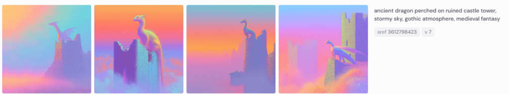 例:ancient dragon perched on ruined castle tower, stormy sky, gothic atmosphere, medieval fantasy --sref 3612798423