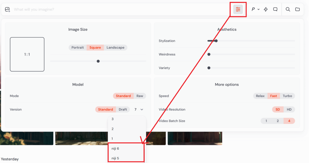 Web版Midjourneyでは、画像生成前にモデルを変更するだけでOKです。