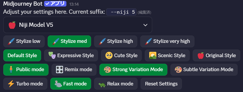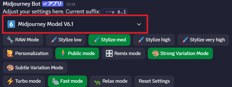 Discord版Midjourneyでは、コマンドを使って設定を変更します。