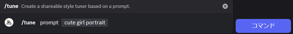 まずはDiscordでMidjourneyが使える状態にして、いつもの /imagine の代わりに /tune コマンドを入力します。