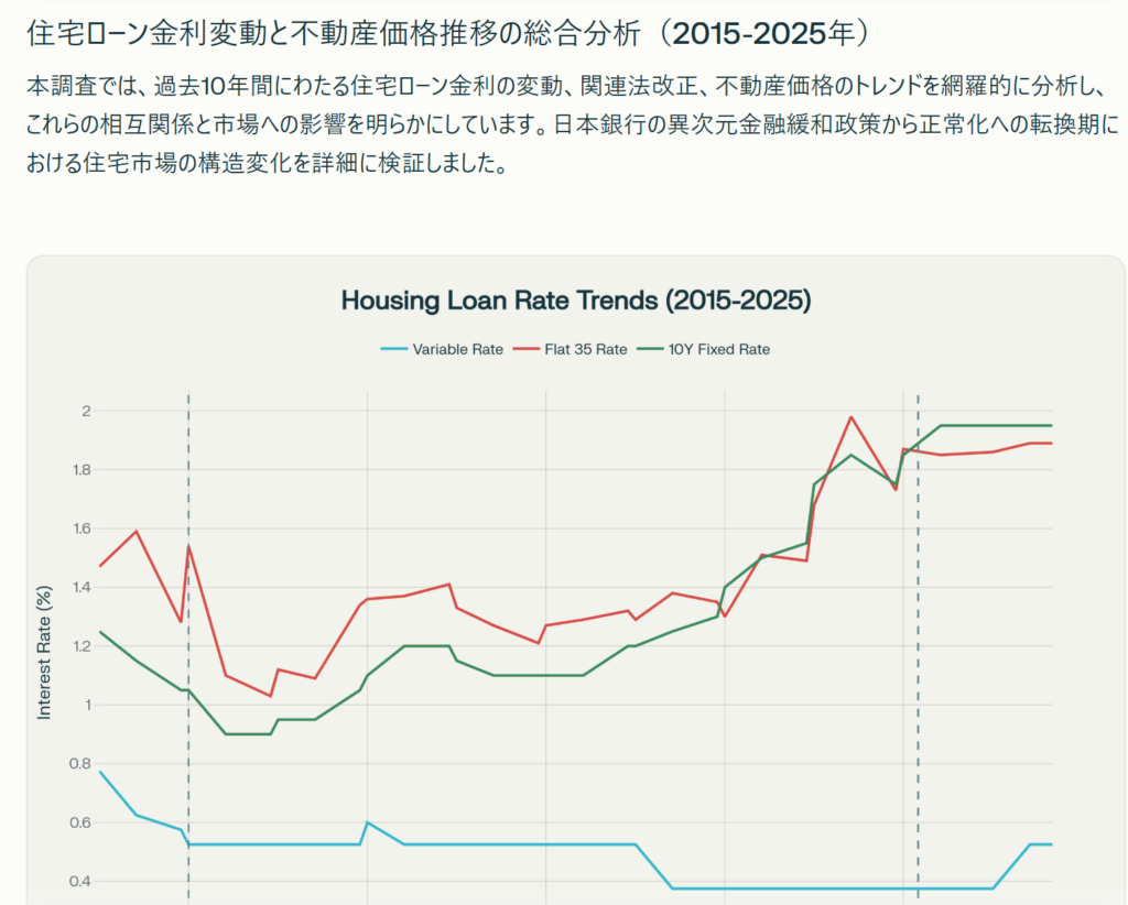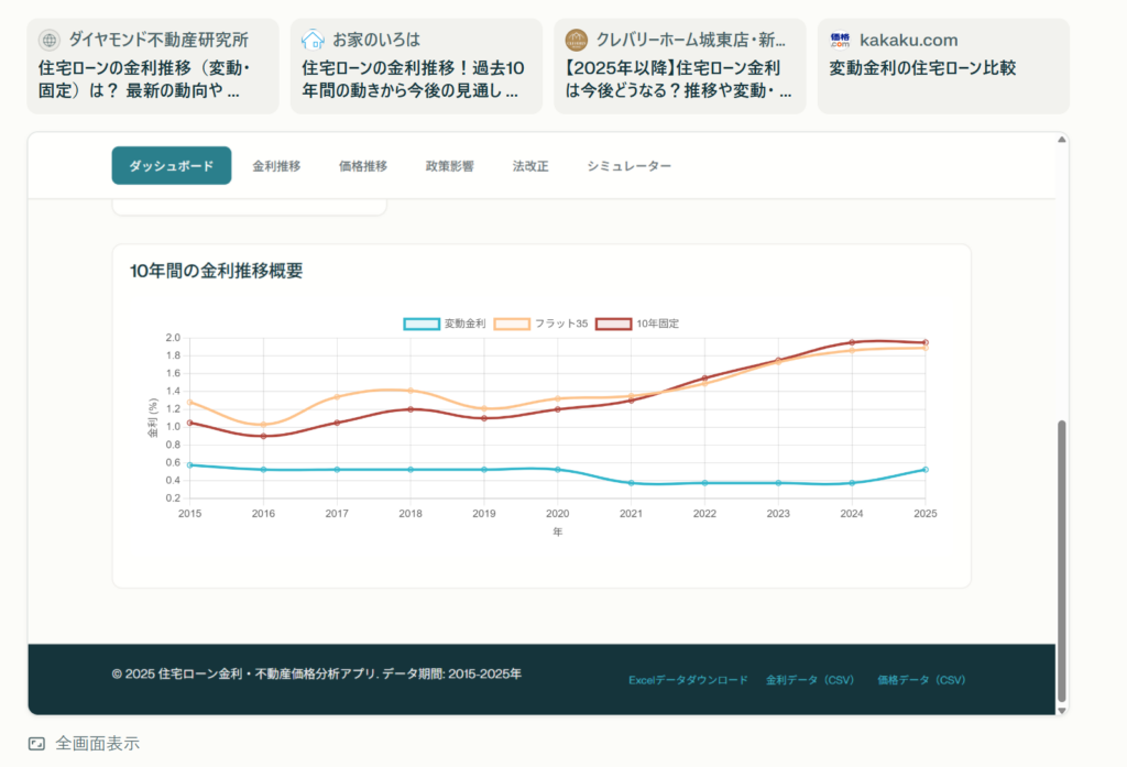 「住宅ローンの金利変動を過去10年分調査し、関連法改正や住宅価格のトレンドを総まとめし、分析用スプレッドシートとパワーポイント資料、主要指標のグラフ化とWeb可視化アプリも出力してください。」