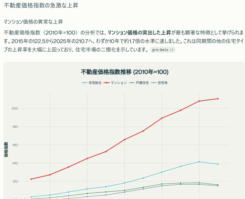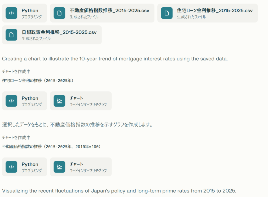 過去10年間の住宅ローンに関係する数値をグラフでまとめ、市場や住宅ローン金利の分析を行って、レポート形式でまとめてくれました。単に入力されたことだけでなく、様々な面から多角的に分析してまとめてくれるのもよいポイントですね。