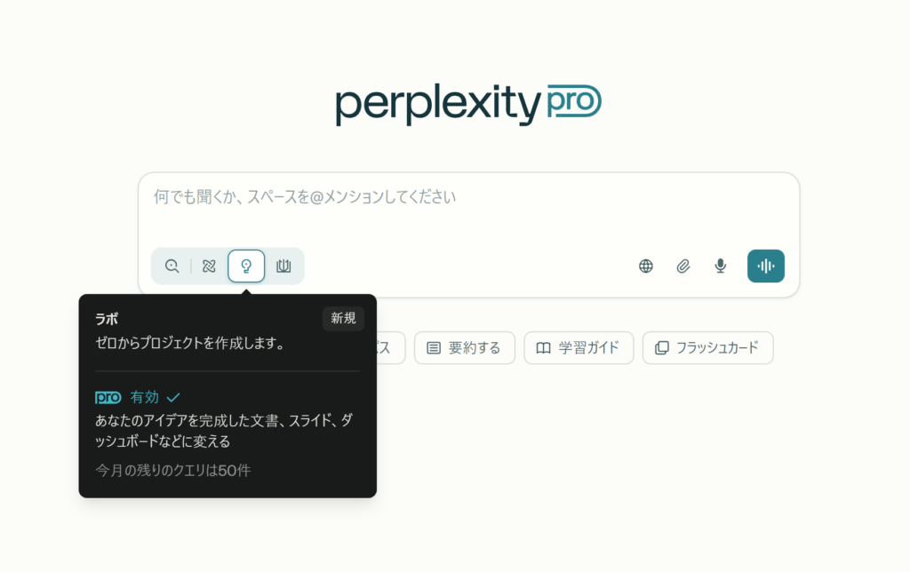 Perplexity Labsは、現在Perplexity Pro(有料プラン)のユーザー向け機能となっており、利用には月50回の制限が設けられています。