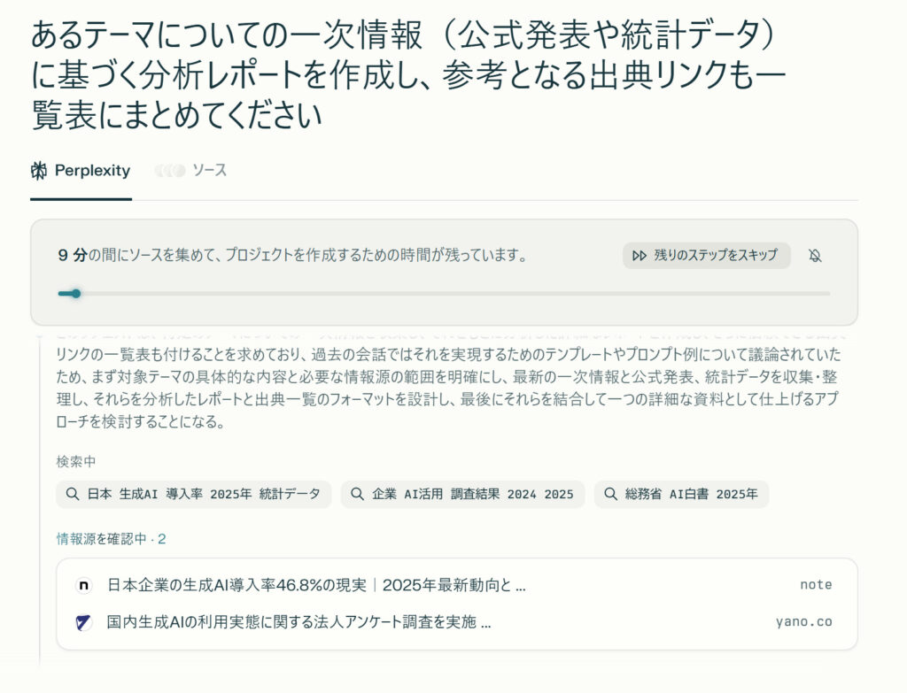 従来のPerplexityが「質問に答える」対話型の検索エンジンだったのに対し、Labsはもっと複雑で専門的な作業を自動で実行してくれます