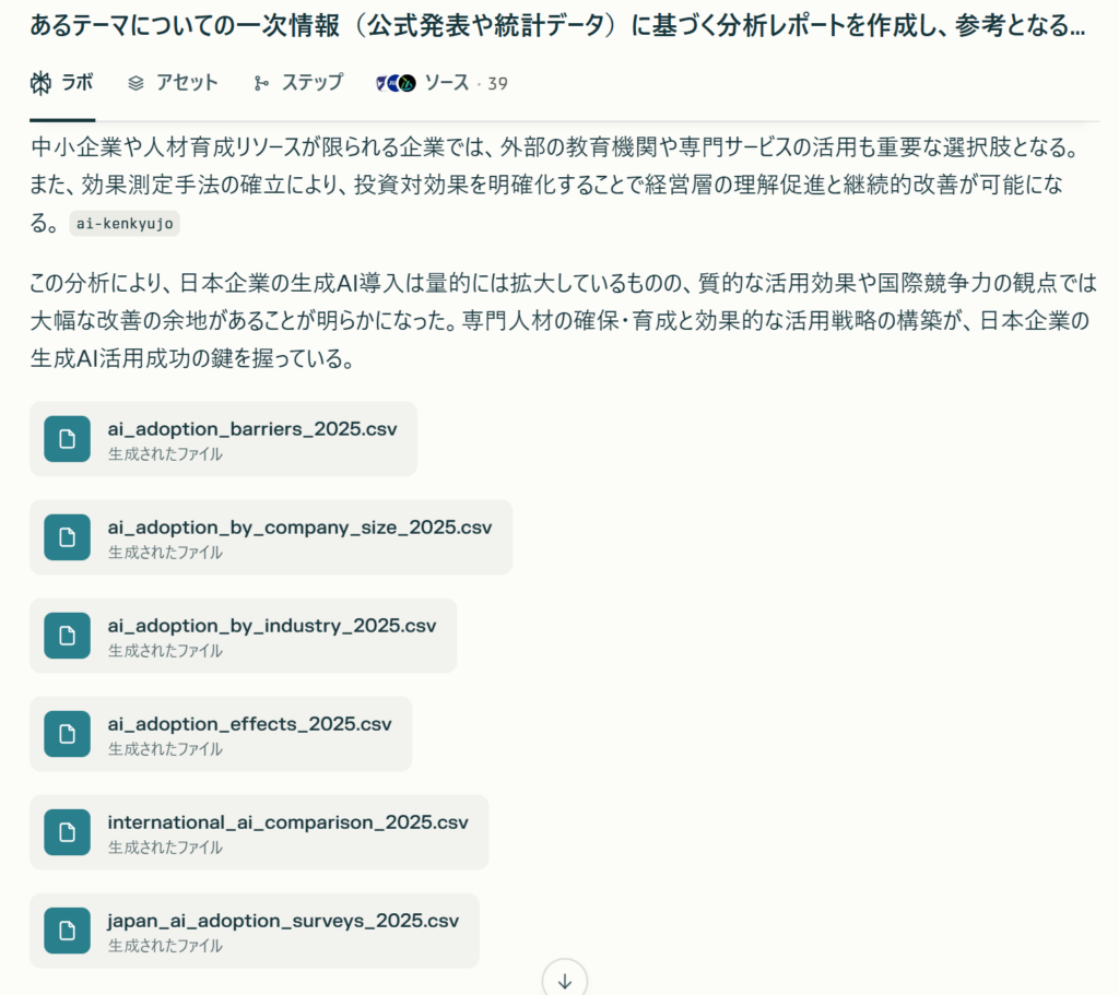 このように、かなり複雑で多岐にわたる指示でも、Labsは各タスクを正確に実行してくれました。たくさんのグラフを用いて可視化したり、各項目ごとにセクションを分けてまとめているのが特徴ですね。人間が1日かけて作成するようなクオリティの資料一式をわずか数分で納品してくれました。