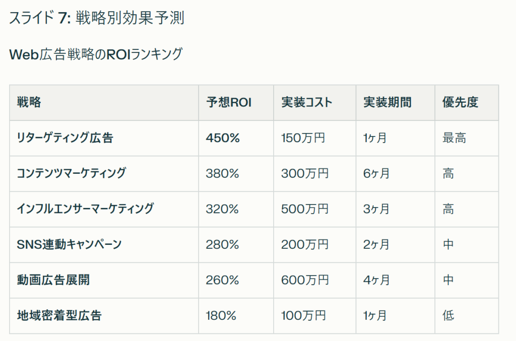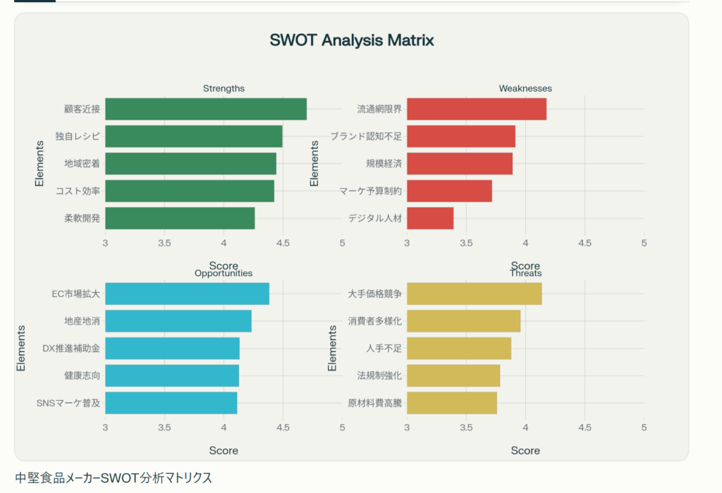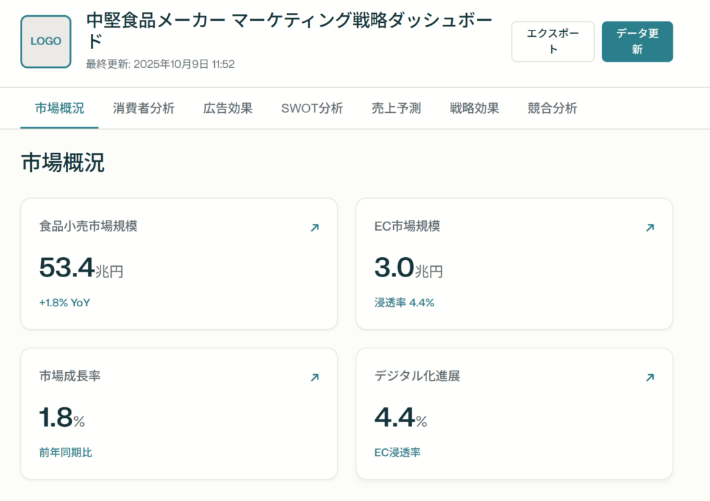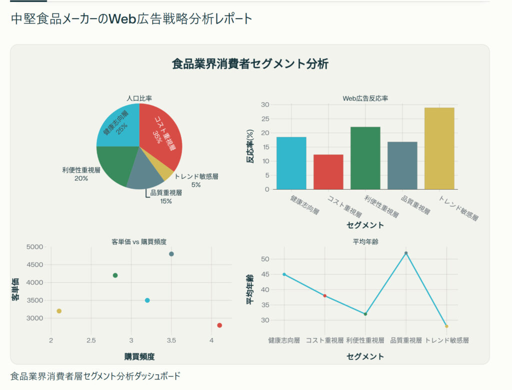 「中堅食品メーカーのWeb広告戦略を分析し、消費者層のデータを可視化してください。また売上の推移を予測してグラフ化して、主要競合とのSWOT分析を行ってください。それらをまとめたレポートとスライド資料、さらにダッシュボードアプリも自動生成してください。」
