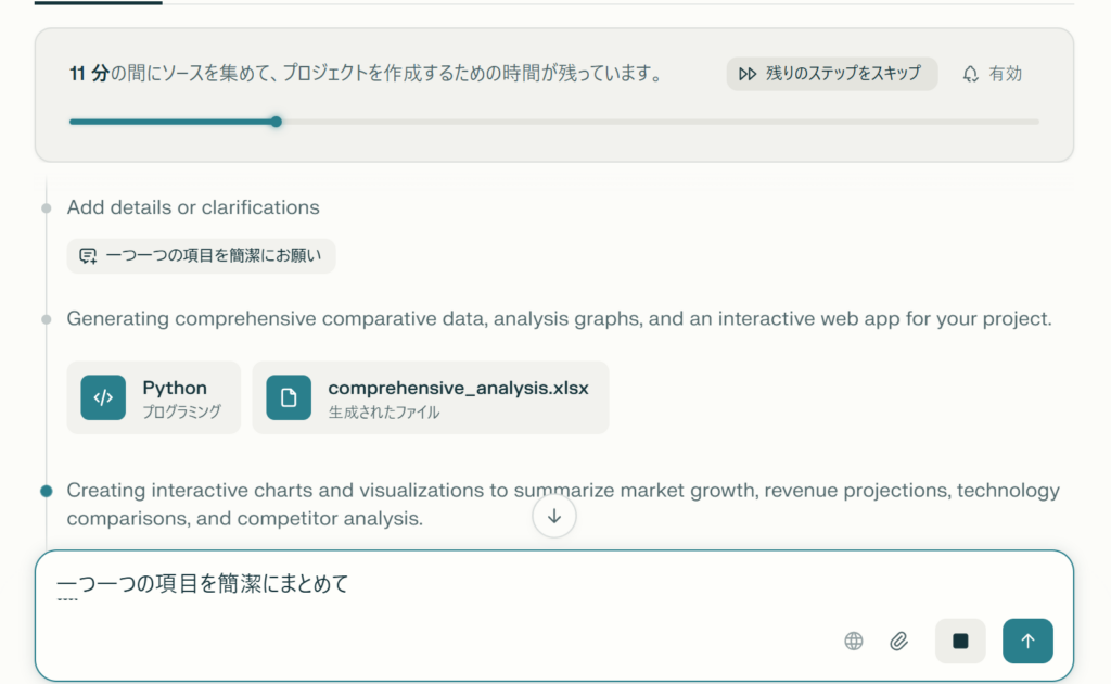 例えば、「〇〇の市場調査をしてレポートとスライドを作成して」といった指示を出すだけで、Labsは内部で複数のAIエージェントからなる仮想のチームを編成します。そして、情報収集、データ分析、コーディング、資料作成といった各工程を分担し、最終的な成果物まで作成してくれるのです。