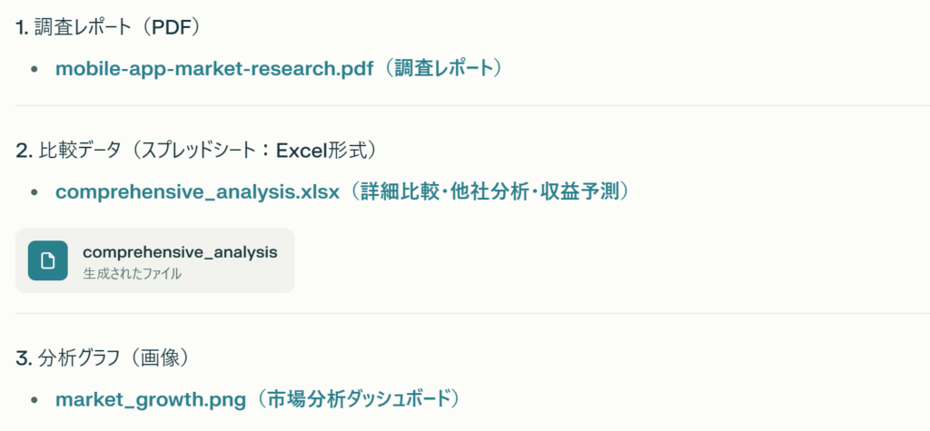 例えば、「競合分析をして」と頼むだけで、以下の資料一式が数分で作成されます。