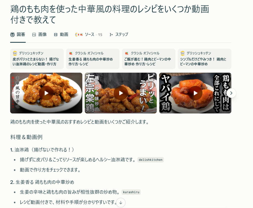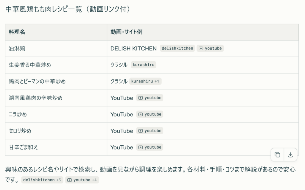 このように、気になったレシピをYoutubeやクラシルで動画で確認できるようにリンク付きで表示してくれます。また、最後に見やすいように表にまとめてくれているのも非常に便利ですね。