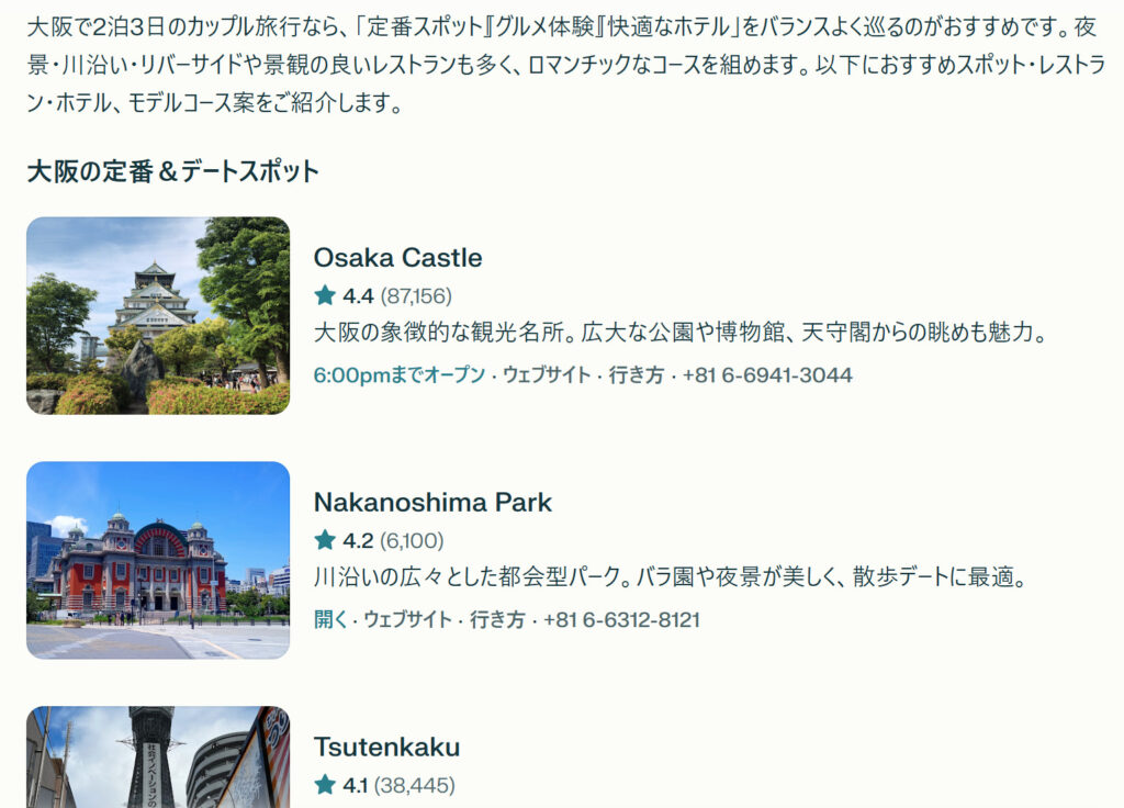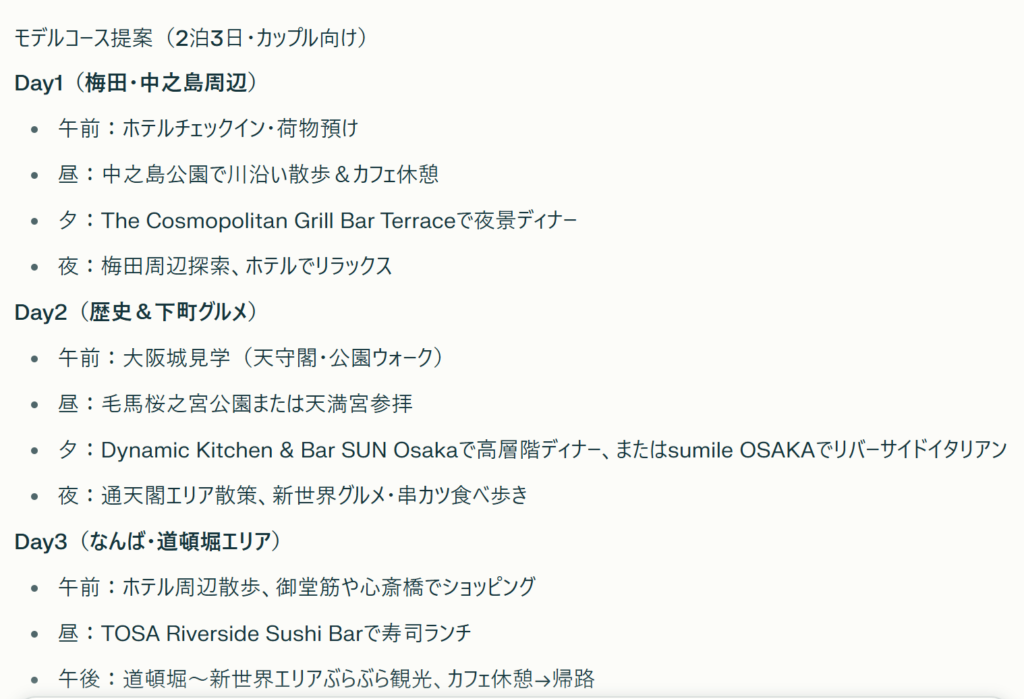 「彼女との2泊3日の大阪旅行を考えています。大阪のおすすめスポットやグルメ、ホテルなどを教えて。あとモデルコースも考えて」