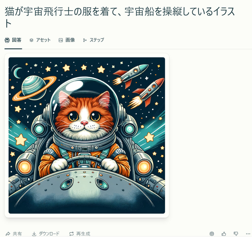 例えば、「猫が宇宙飛行士の服を着て、宇宙船を操縦しているイラスト」のように、頭の中に描いたイメージを言葉で伝えるだけで、AIが瞬時に画像を作り出してくれます。ブログ記事の挿絵やプレゼンテーション資料、SNS投稿など、様々な場面で活用できます。
