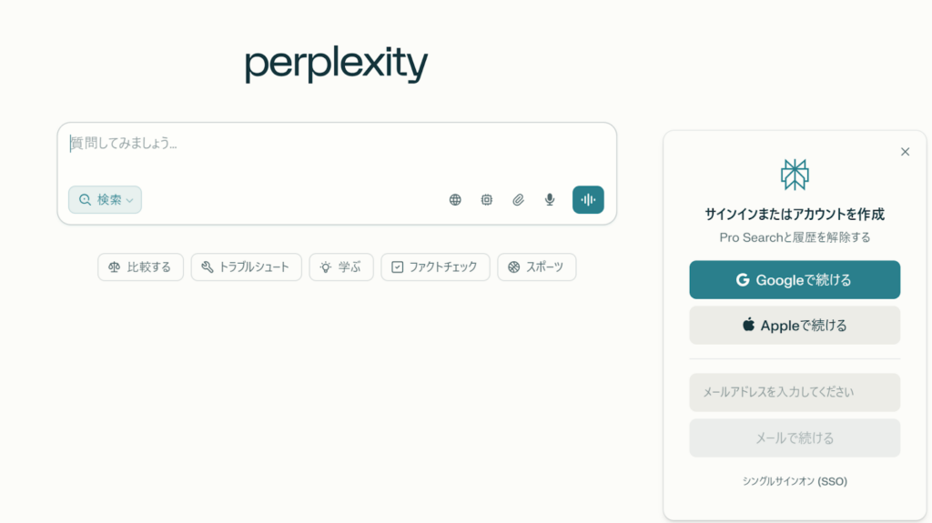 Perplexityを開くことができたら、画面右の「サインインまたはアカウントを作成」からサインインする。Google、Apple、メールのいずれかでサインイン可能です。