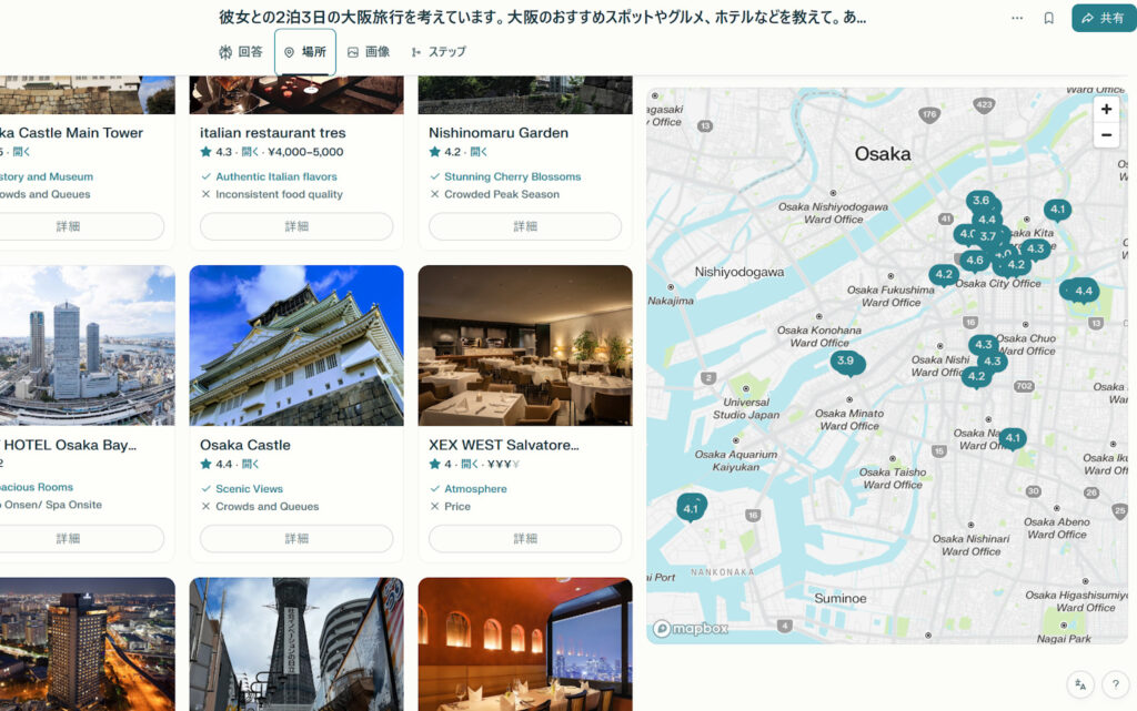 このように、お願いしたことを調べてくれて、写真やウェブサイトのリンク付きでわかりやすくまとめてくれます。また、上部の「場所」または「場所をもっと見る」をクリックすると、下の画像のようにより多くのお店や施設の場所を地図上で確認できます。