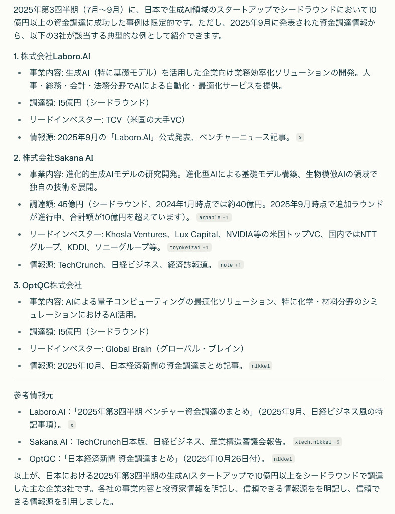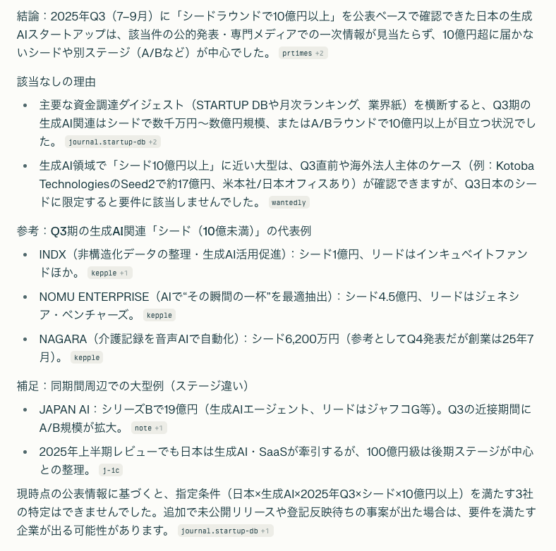 Sonarの回答では質問に対して明確に整理された回答の印象があります。GPT-5では該当する企業がないと示した上でそれに近い企業・情報をまとめてくれています。