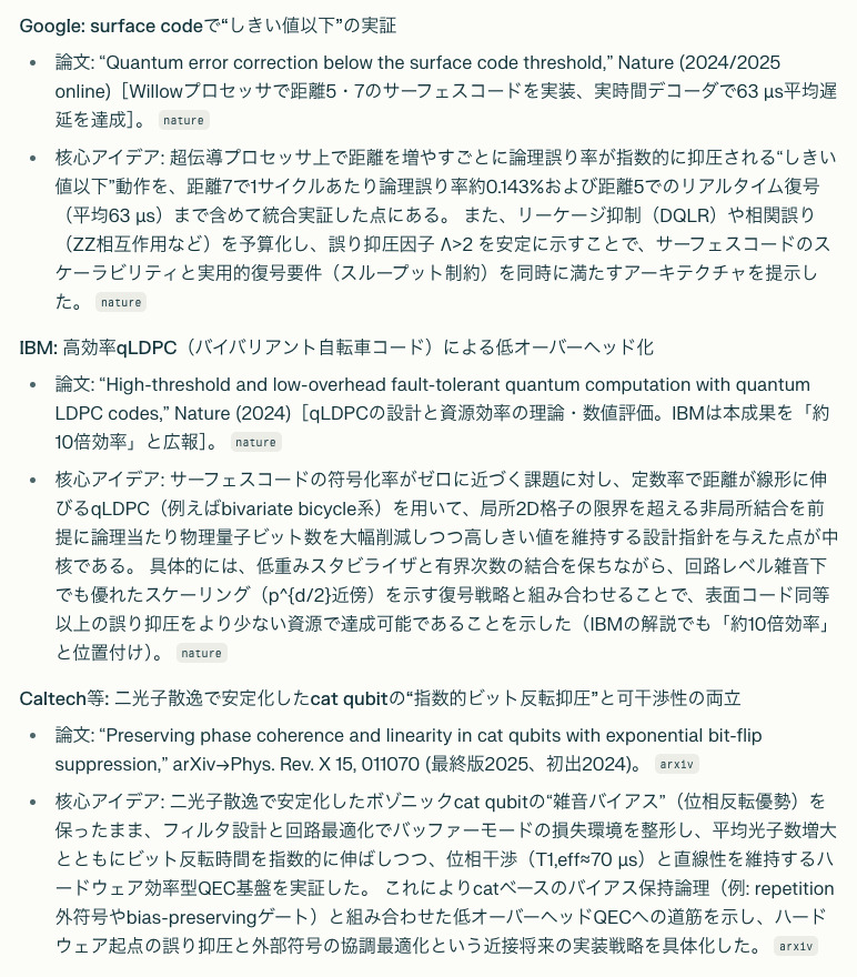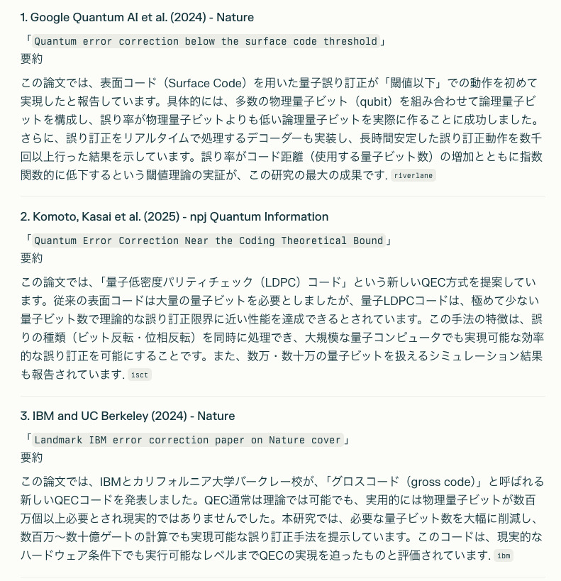 量子コンピューティングにおける『量子誤り訂正(Quantum Error Correction: QEC)』の最新の研究動向について、2024年以降に発表された主要な論文を3つ引用し、それぞれの論文が提案するQEC手法の核心的なアイデアを、専門用語を避けずに簡潔に要約してください。要約には必ず引用元を明記してください。○Sonar