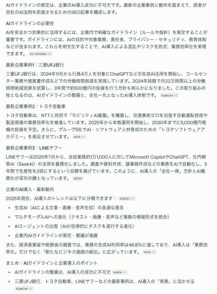 メインキーワード『AIガイドライン』、サブキーワード『企業事例』『最新動向』を用いて、読者が企業のAI導入を進められるようになるためのSEO記事を作成してください。構成案には、必ず最新の企業事例を2つ以上盛り込み、その情報源を引用してください。○Sonar