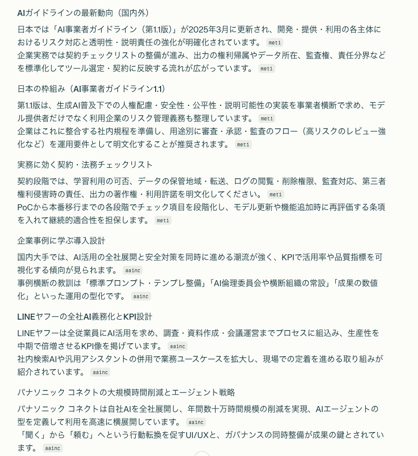 - データ取り扱い:入力前の機密・個情・著作物チェック、匿名化・合意・権利処理、二次利用規約の確認。