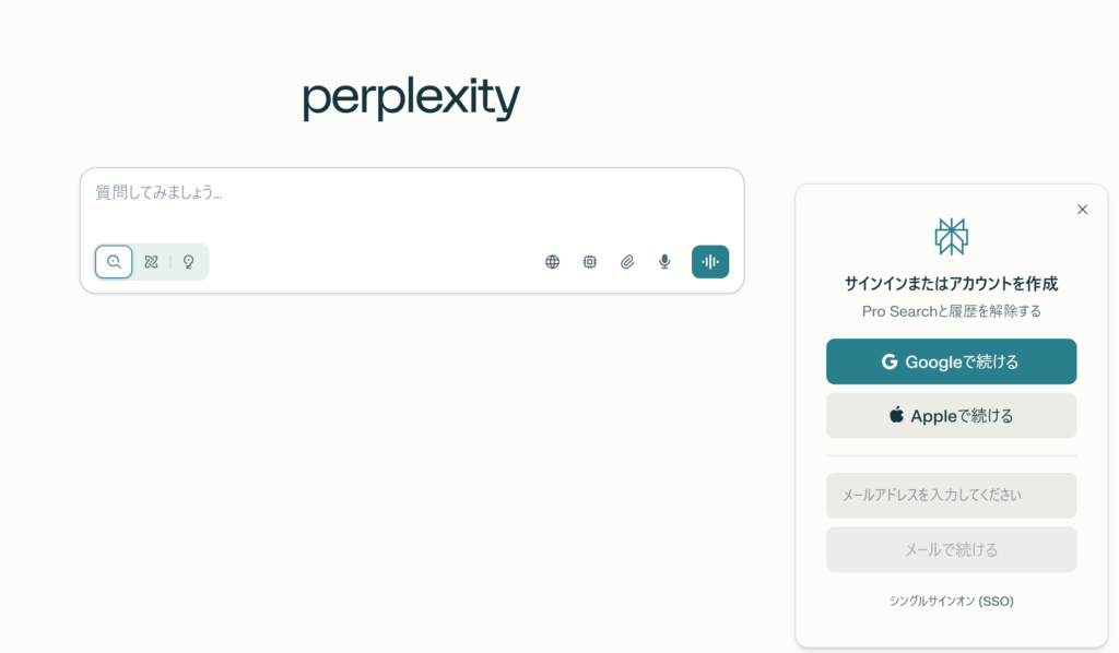 Perplexityを開き、画面右下からGoogleまたはApple、メールでサインインする。