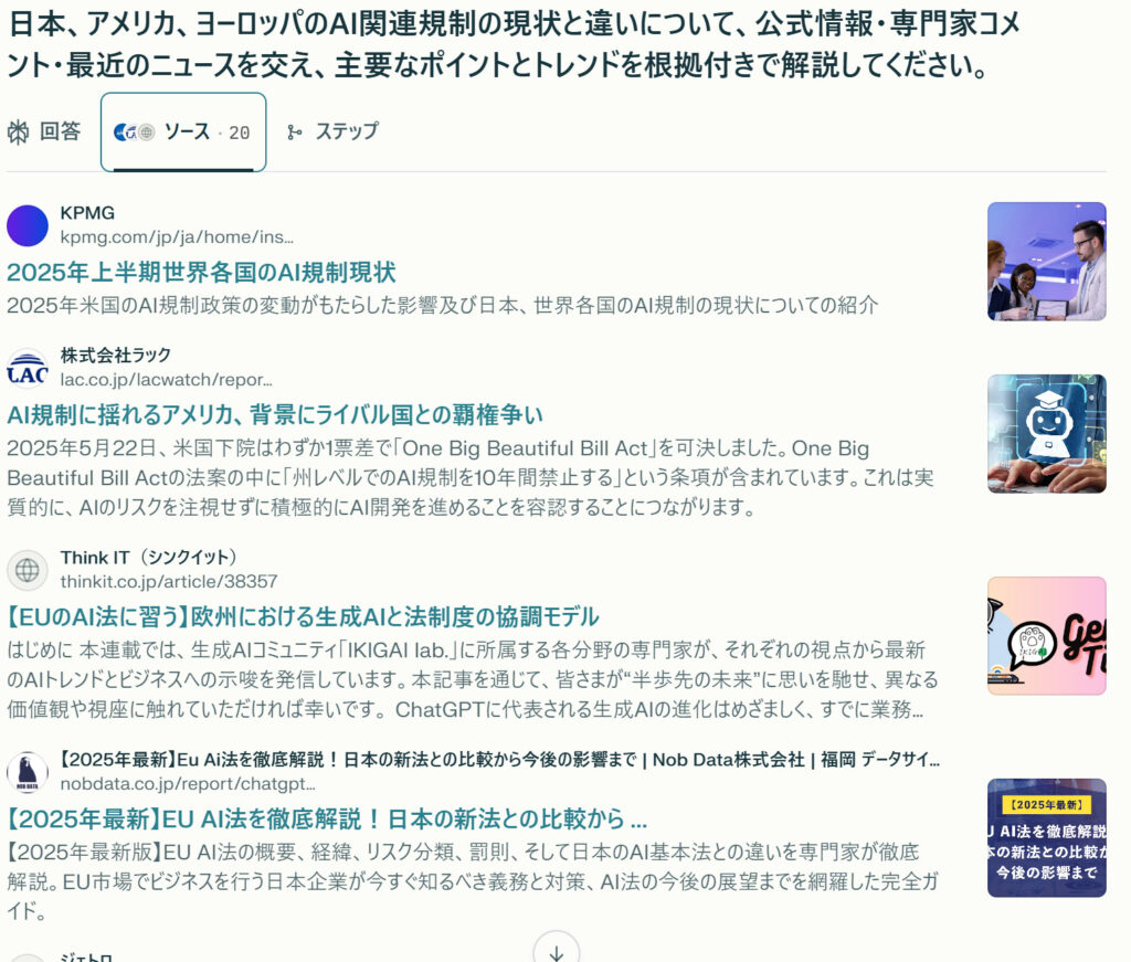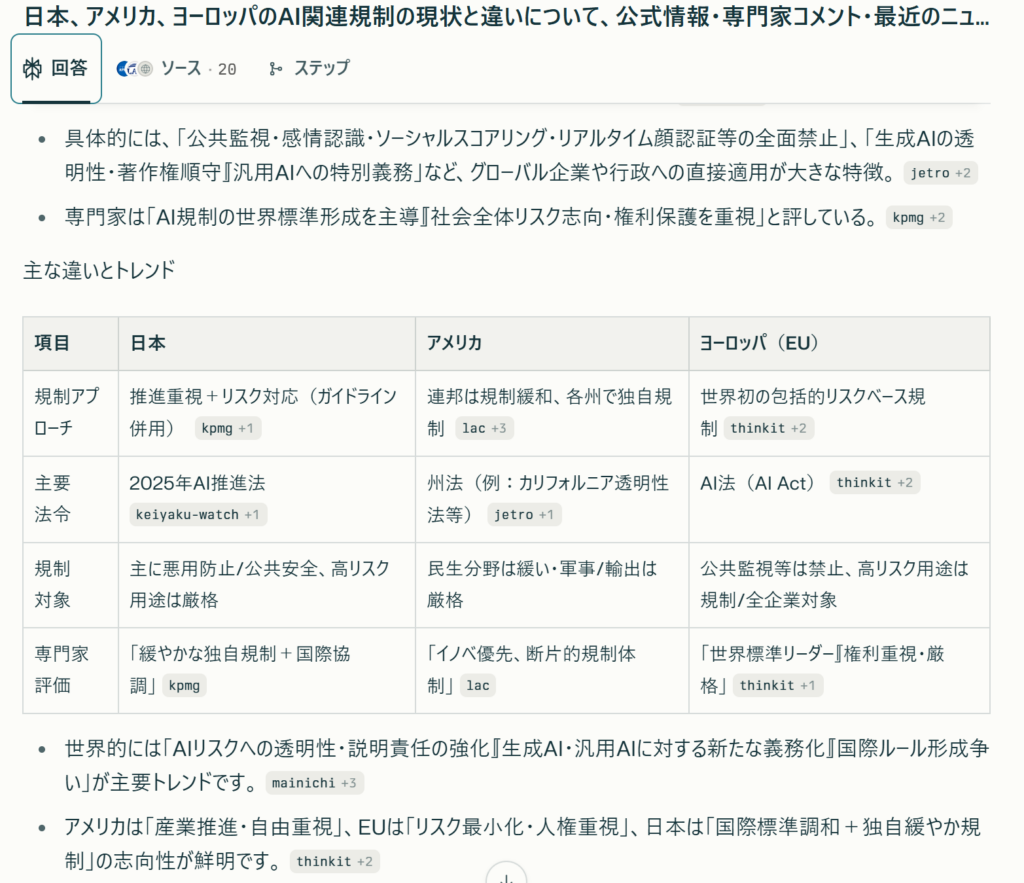 この表をみると、「検索」機能の方が簡潔な回答を即時的に提示するのに対して、「リサーチ」機能の方は詳細な分析を時間をかけてやってくれるということが分かります。