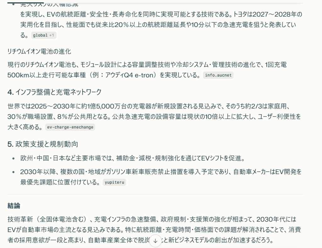 例えば、「電気自動車(EV)の将来性」についてリサーチしたとします。その際、AIが「将来性を語る上では、インフラ整備と充電ネットワーク、政策支援、規制動向などの要素が不可欠だ」と判断します。AIは自動でそれらの技術的詳細や各国の整備状況に関するデータを追加で調査し、次のようなレポートに含めてくれます。