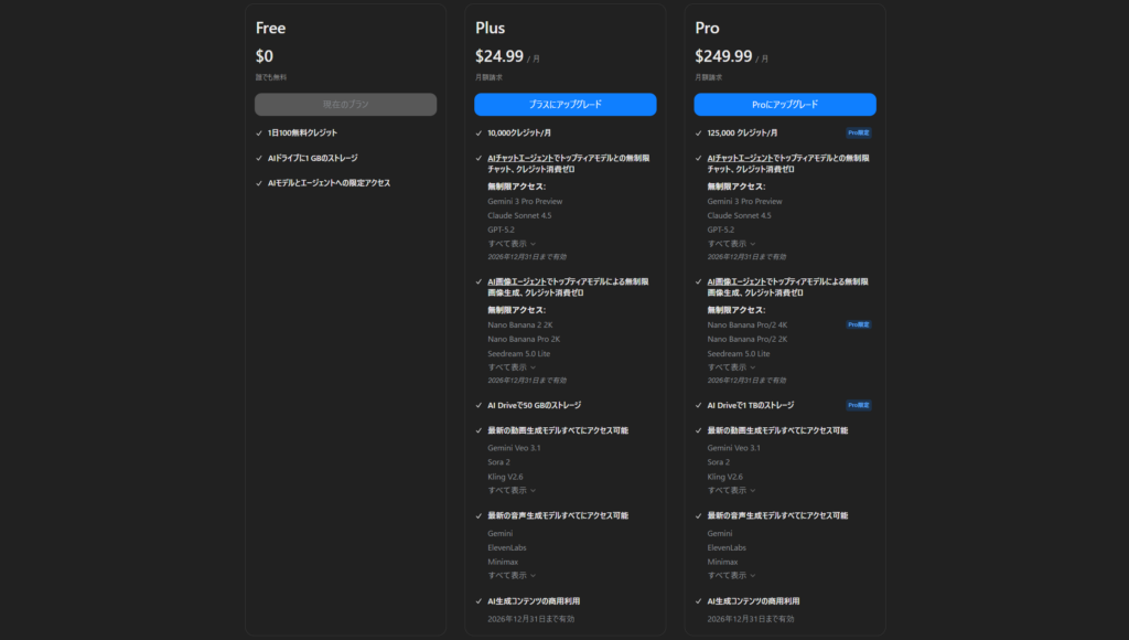 - 料金プランは無料/Plus/Proの3種類が基本。