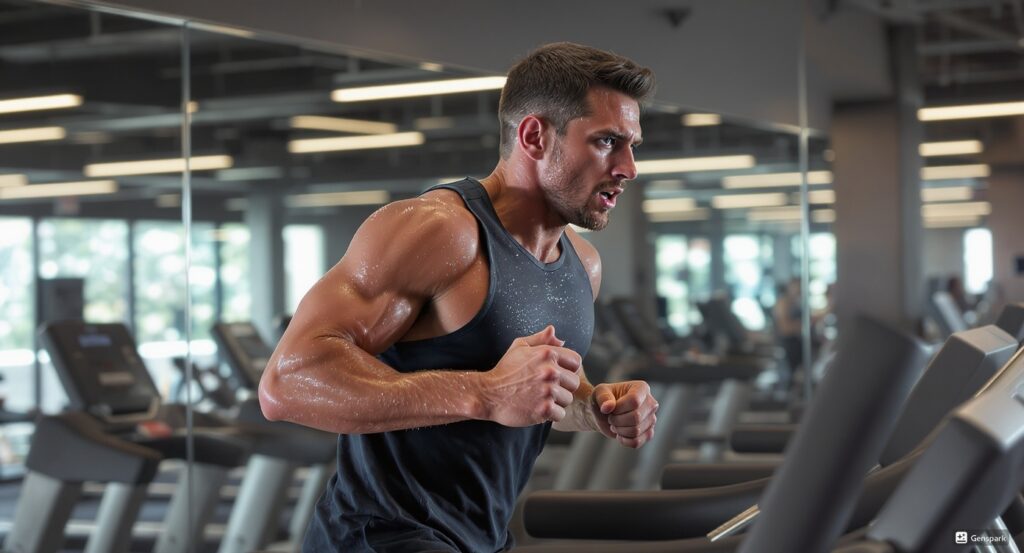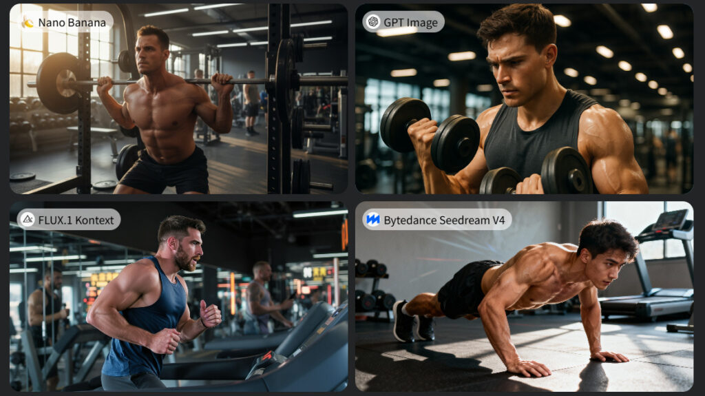 以下はAI画像エージェントにて、自動プロンプトを選択し、「20代男性がジムで筋トレしている画像」と入力した結果、出力された画像です。