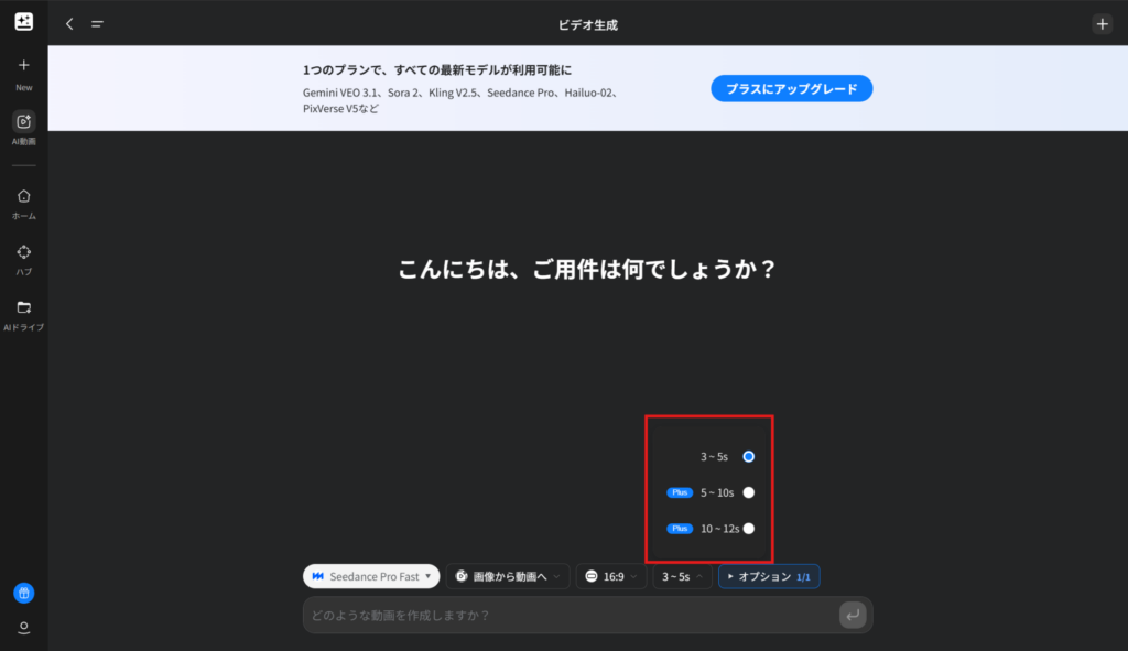 無料プランでは3~5秒の動画のみ生成可能でしたが、Plusプランにすることで、5~12秒の動画を生成することが可能になります。