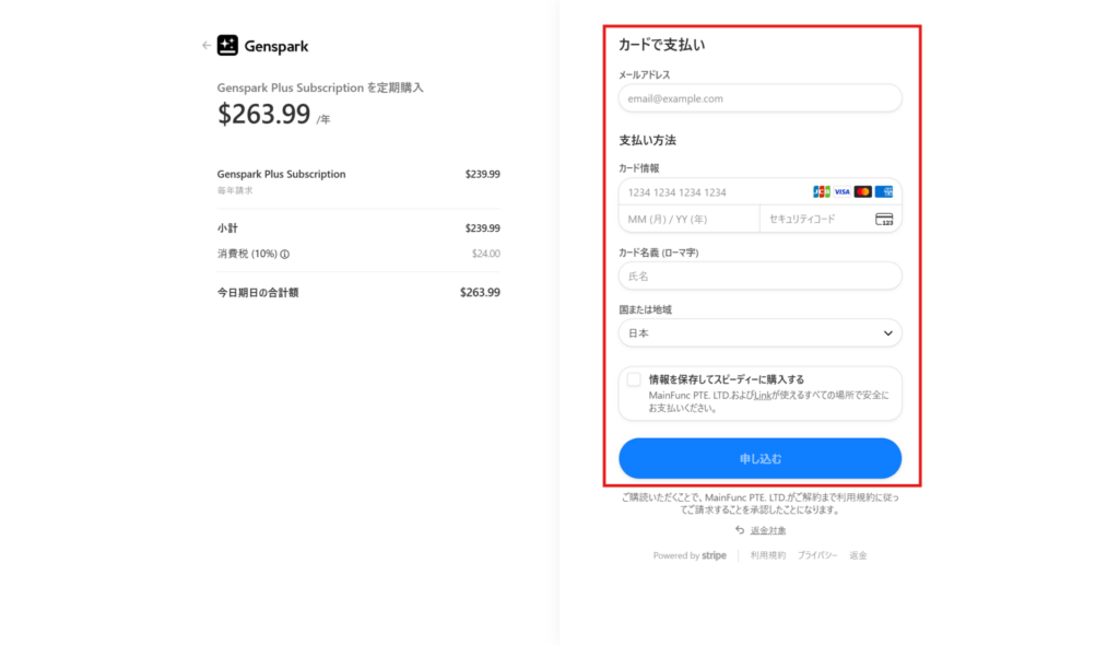 メールアドレス・カード情報・国または地域を入力し、下部の「申し込む」をクリックし完了です。