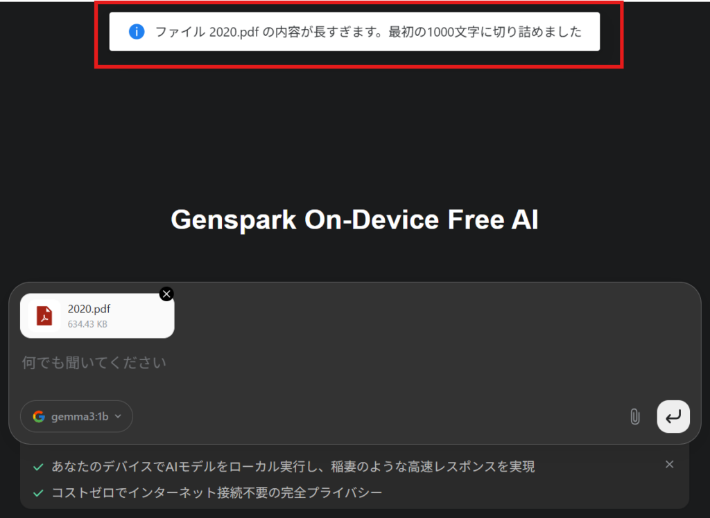 オンデバイスAIは自分のPC内で処理を完結させるため、一度に読み込めるデータ量に物理的な限界があります。そのため、添付資料の文字数が1000文字を超える場合は、最初の1000文字のみ読み込まれる点に注意してください。