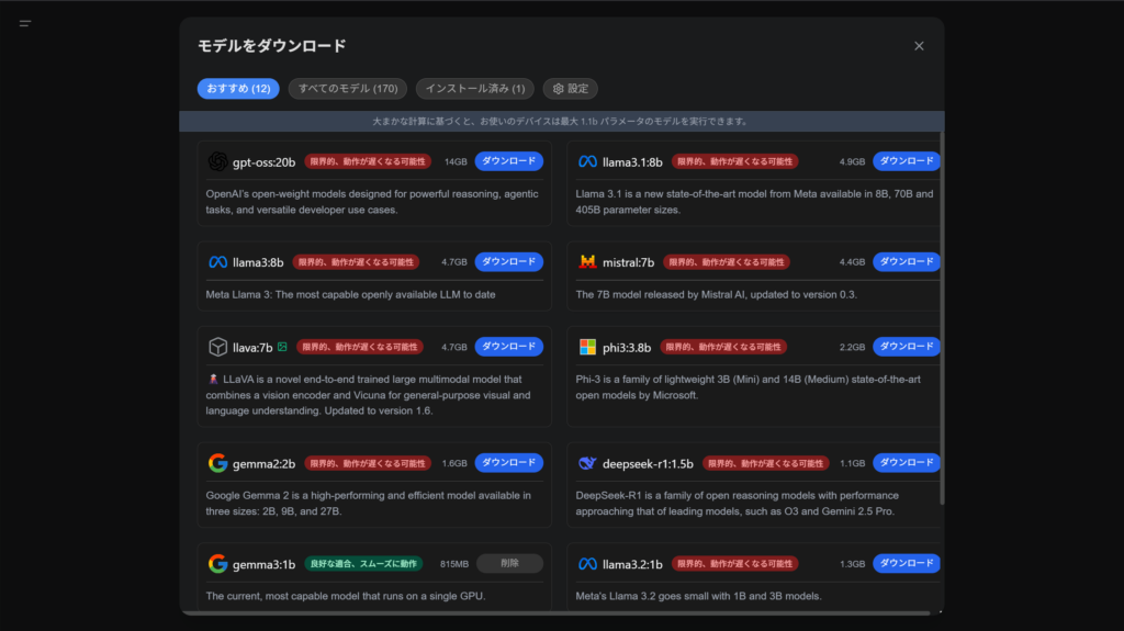 また、ダウンロードできるモデルも使用PCのスペックに依存する点にも注意が必要です。